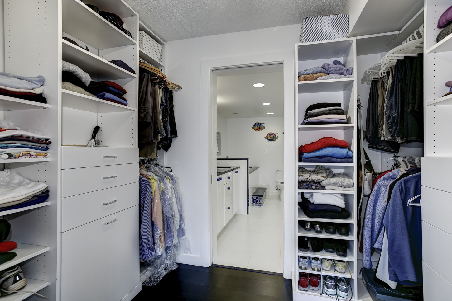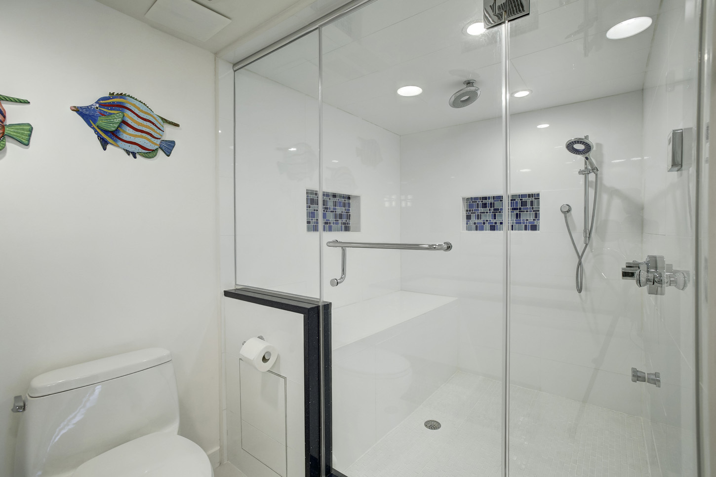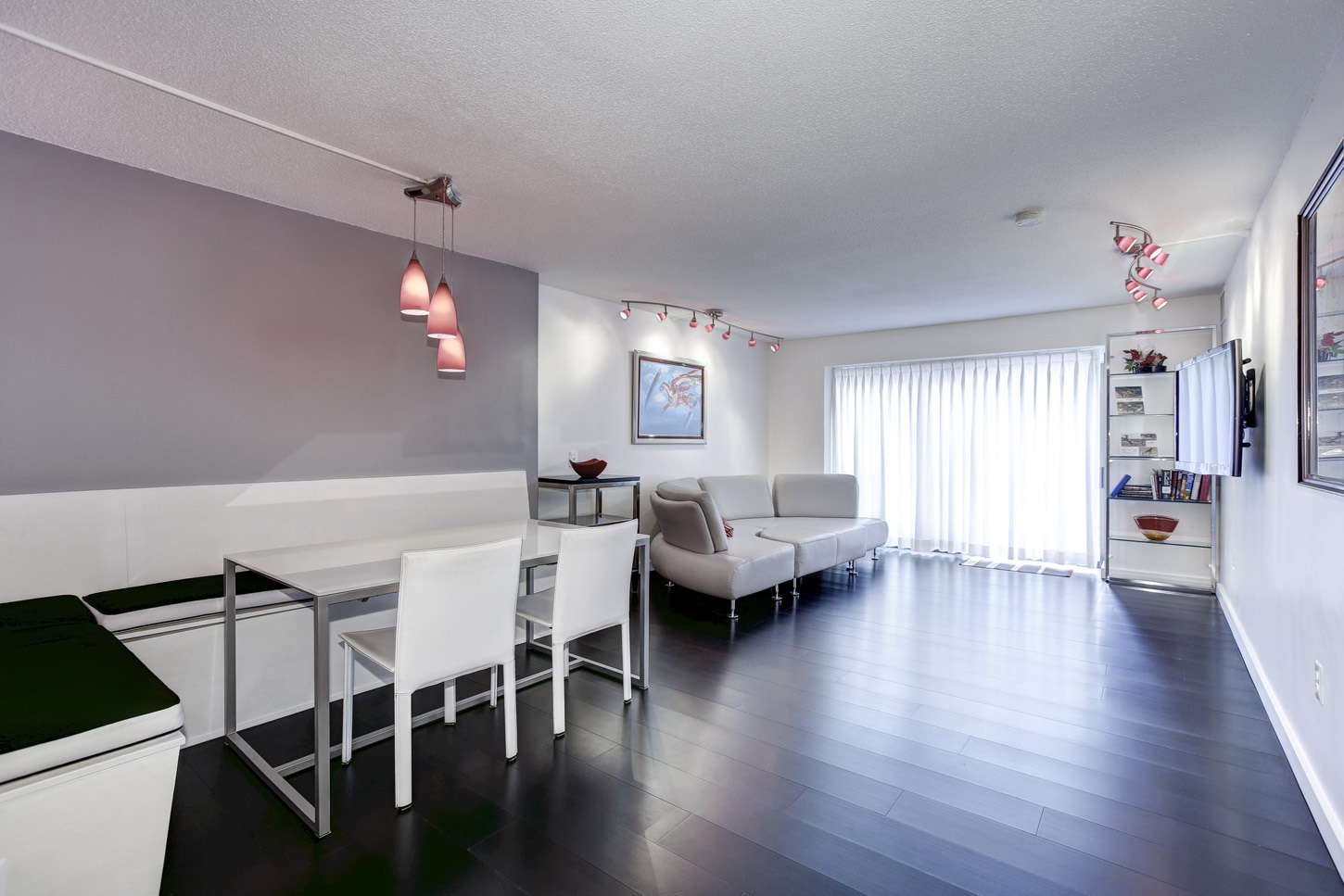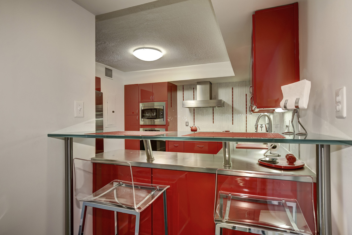 Enter the apartment into a large foyer with coat closet and half-bath. Foyer opens directly into the living room/dining room combo (22x15) with bamboo floors. Sliding glass doors in the living room lead out onto a large balcony. Dining area has built-in seating. Renovated galley kitchen comes fully equipped with stainless steel electric range, separate cook-top, updated refrigerator, dishwasher, microwave and garbage disposal along with lots of cabinet space. Washer/dryer stack unit located in hallway. Hallway from living area leads back to the well-proportioned bedrooms. Master bedroom (17x15) includes bamboo floors, a walk-in closet and a full bath with double sinks, soaking tub and separate shower/steamroom. Sliding glass doors in master bedroom lead out onto a small balcony overlooking a courtyard. Second bedroom (16x14) also has bamboo floors. Full hall bath located just outside the bedrooms.